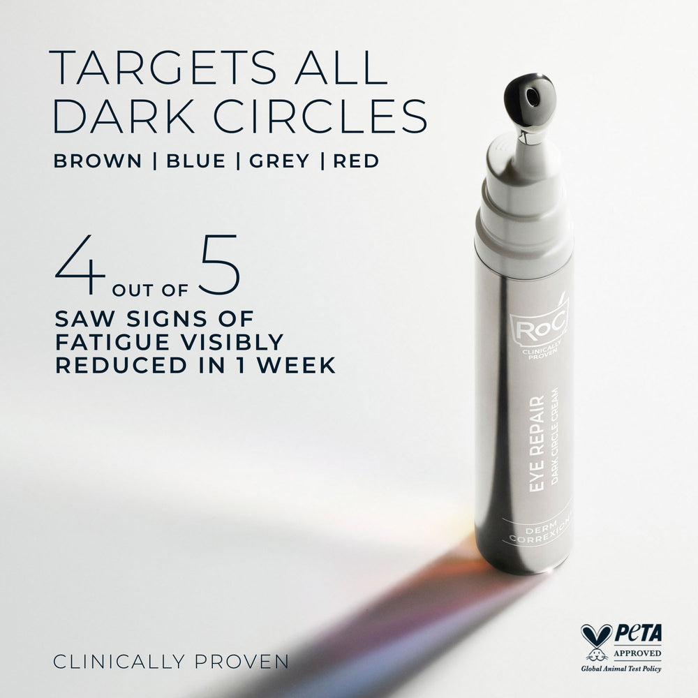 Defy the look of eye fatigue with a patented breakthrough from RoC®. NEW Derm Correxion Eye Repair Dark Circle Cream, developed with Dermatologists & Cosmetic Surgeons, is a non-invasive eye treatment that helps reverse the look of persistent dark circles for dramatically brighter, rested, younger-looking eyes. Inspired by advanced lasers, this formula combines 4 ingredients clinically proven to reduce the 4 shades of under-eye discoloration instantly & over time. Cooling precision tip massages away signs of fatigue.